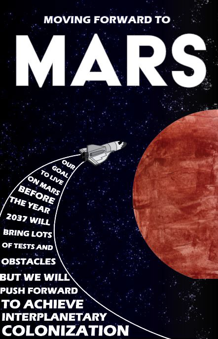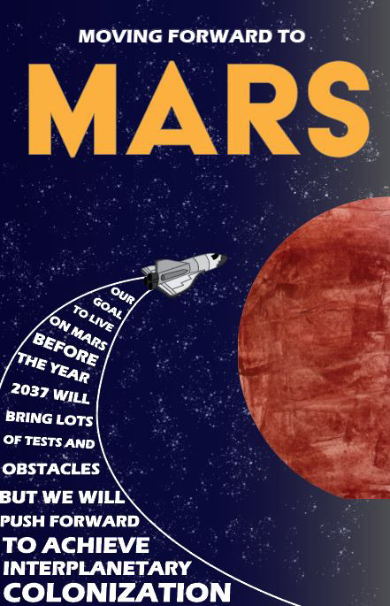 Mars, a destination we will reach soon, has been discussed a lot over the past decade. I tried to create a poster that would talk about the idea of going to Mars, while staying under the limitations of “Moving Forward,” as the theme for the poster. I hand painted the textures for the planet and the texture on the main MARS type is the same image. I also designed a space layout with shading and color that displays a spaceship and text talking about this journey.