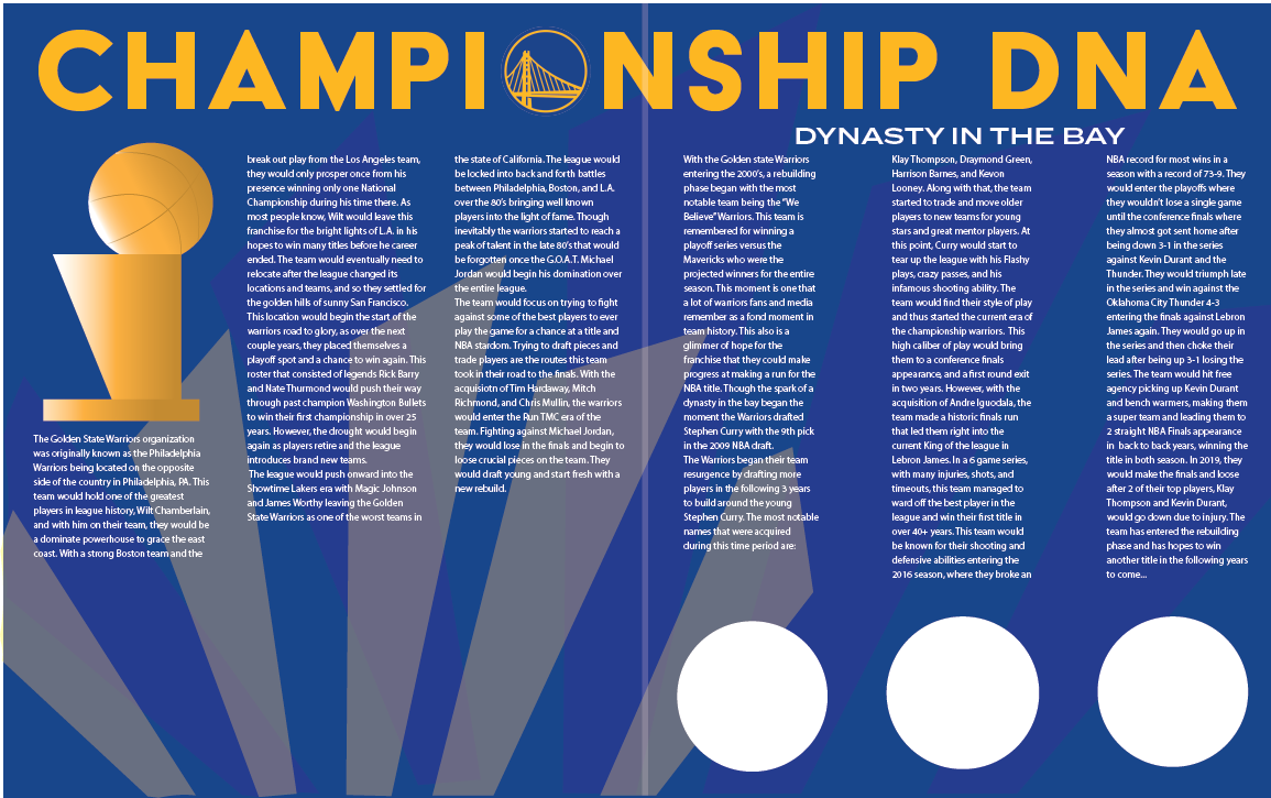 This project encapsulates the Golden State Warriors basketball team into a description about their history from then to now. The main concept is a magazine spread cover and two-page interior all focused on this very topic. Within each page, I tried to incorporate imagery and vector designs that symbolize San Francisco (where they play) and in-game shots of the team.
